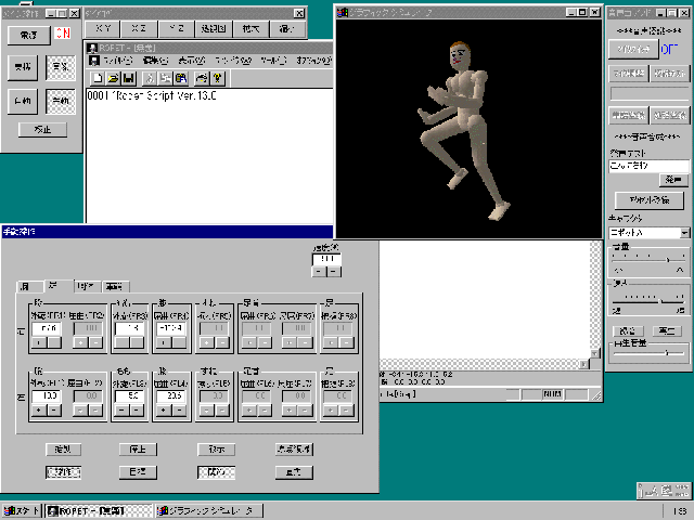 | 民生用ロボットの動作を制御する為の基本ソフトです。 全32軸の関節を操作する事ができ、また、音声による指示、状況に応じた発声も行えますので、あたかも人間のような動作をシミュレートさせる事ができます。 専用プログラム言語を使用する事による動作も可能です。 また、パソコンでDirectXを使用した3Dグラフィックロボットの動作シミュレータとして使用する事も可能です。 |